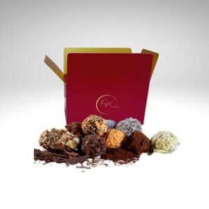Elke truffel heeft een kern van romige, zijdezachte vulling, omhuld door een delicate laag witte chocolade en subtiel bestoven met schilfers voor een elegante, klassieke afwerking.